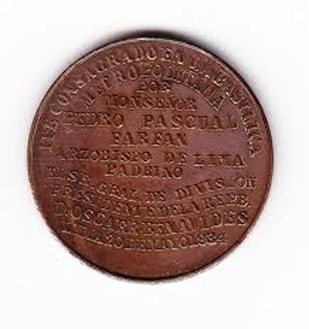 Text: Consagrado en la Basilica Metropolitana por Monseñor Pedro Pascual Farfan, arzobispo de Lima. Padrino. Sr. Gral de division Presidente de la Repb. D. Oscar Benavides Lima 20 de Mayo 1934