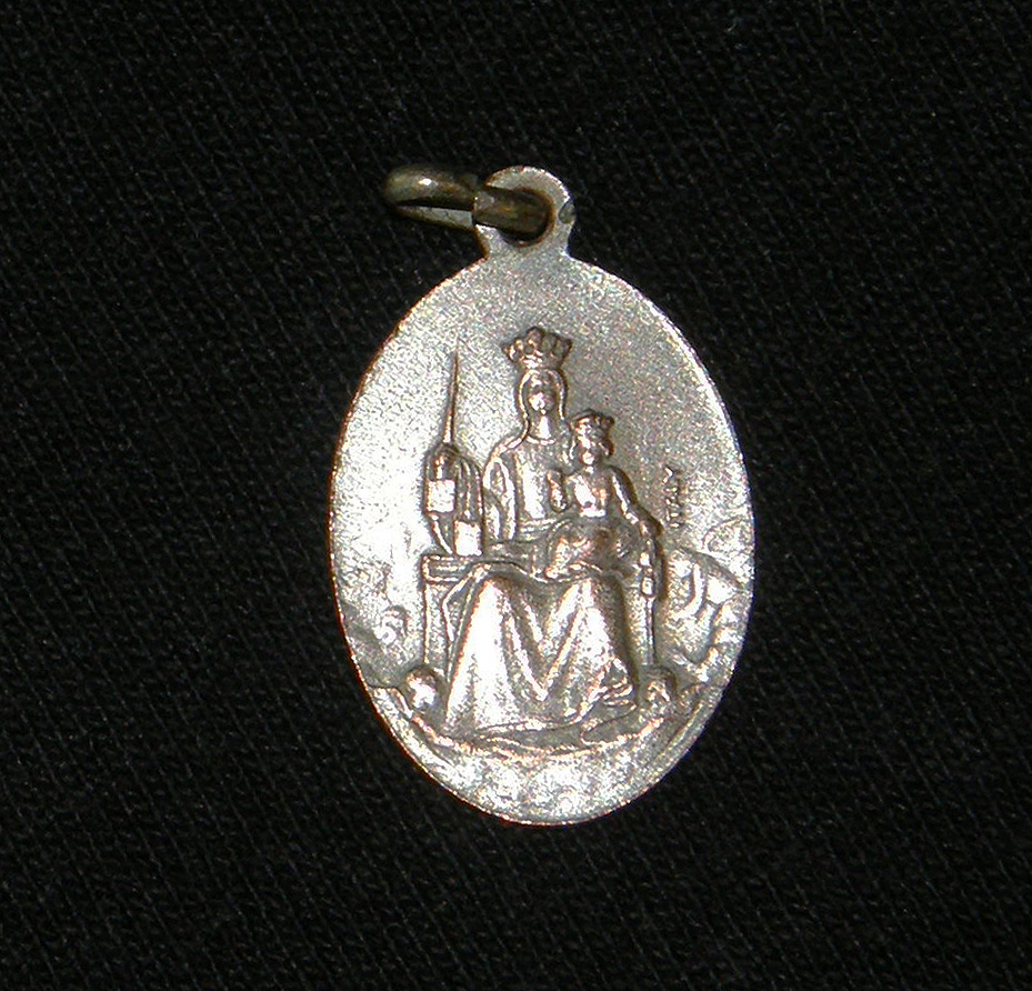Reverse, Our Lady of Mt. Carmel, child Jesus on her knee, holding scapulars; marked Italy