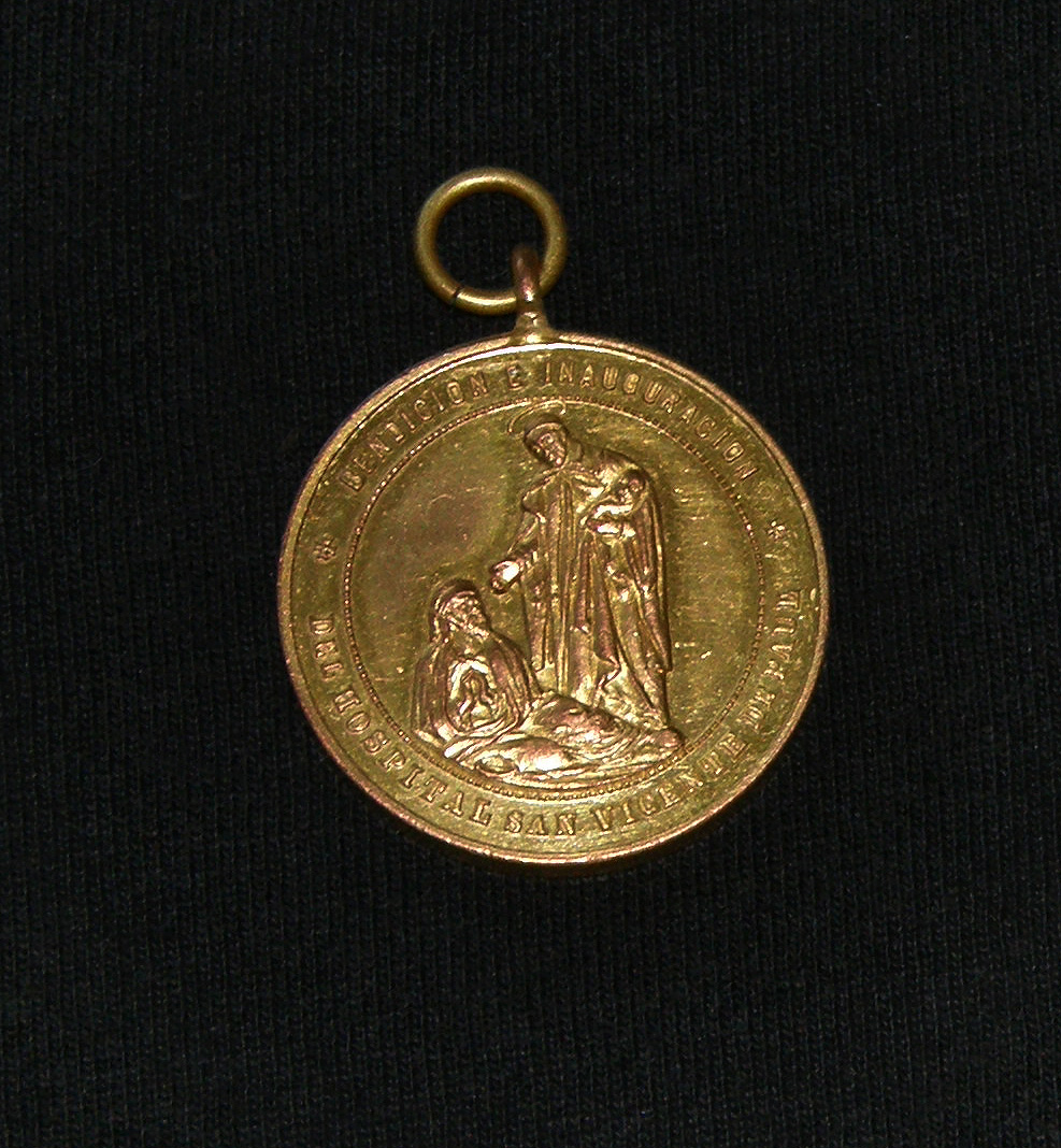 Obverse, bronze medal, loop and ring; Vincent de Paul, standing, cassock, mantle, skullcap, halo, holding infant, gesturing to poor man; Spanish text, for inauguration of SVdP hospital (no place), 19 July 1894 (reverse)