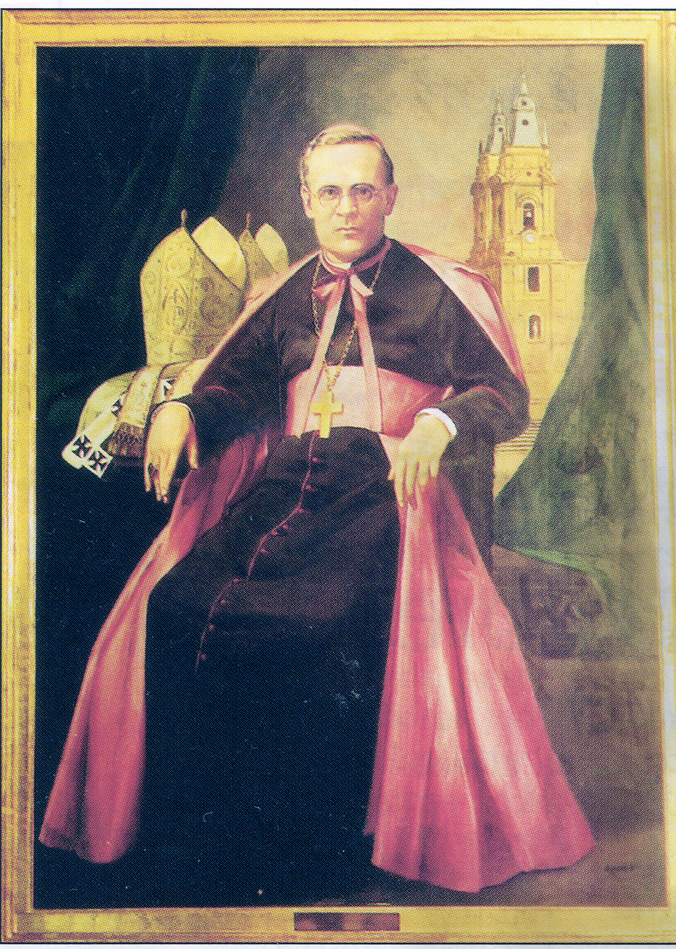 Showing two miters, recalling his two dioceses.