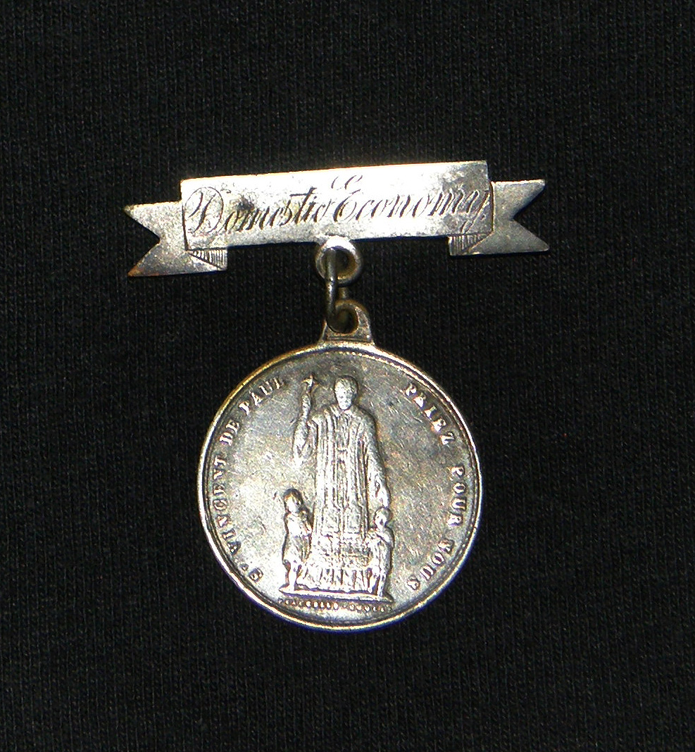 Obverse, round silver medal, loop and ring, with silver ribbon, English text; Vincent de Paul, cassock, surplice, stole, two children; French text; reverse, inscribed Piété, for school prize awards