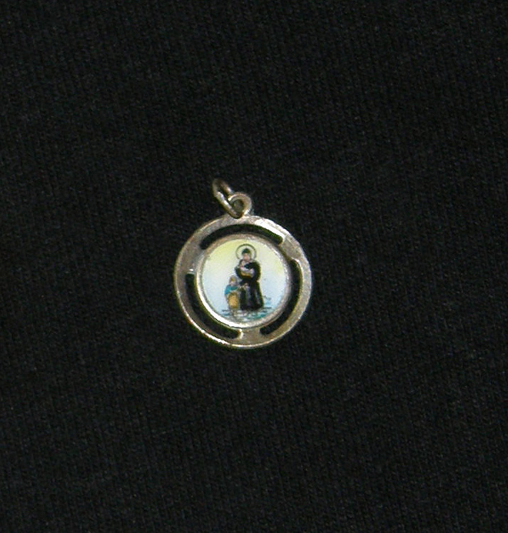 Obverse, very small round medal, loop and ring; colored enameled figures of Vincent de Paul, infant, and standing girl; undated
