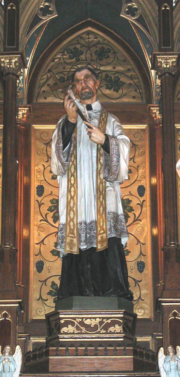 Altar statue, Vincent de Paul, thin face, with crucifix; original in Sacred Heart church, Ljubljana