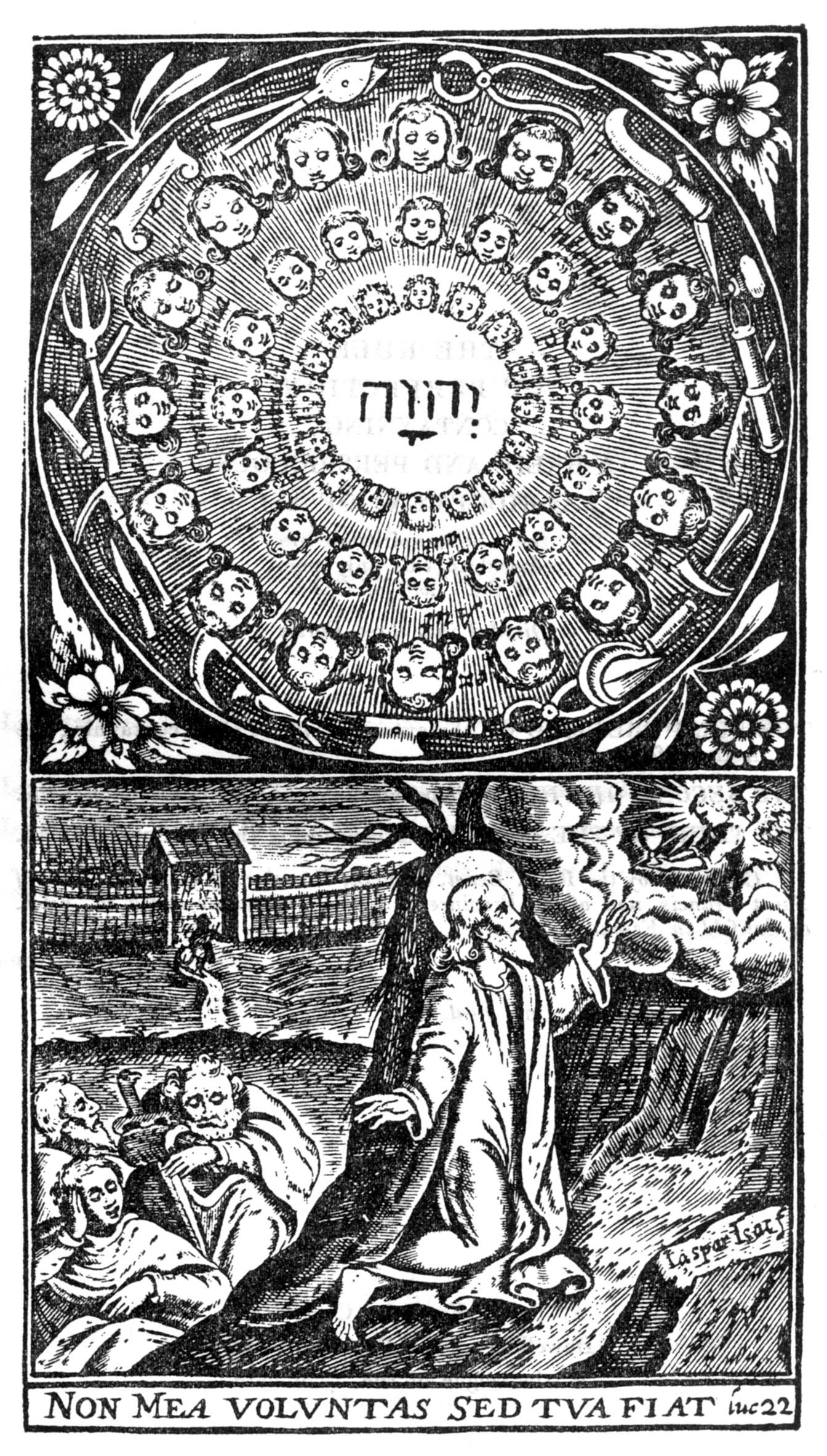 God, surrounded by choirs of angels; Jesus in Garden of Gethsemane
