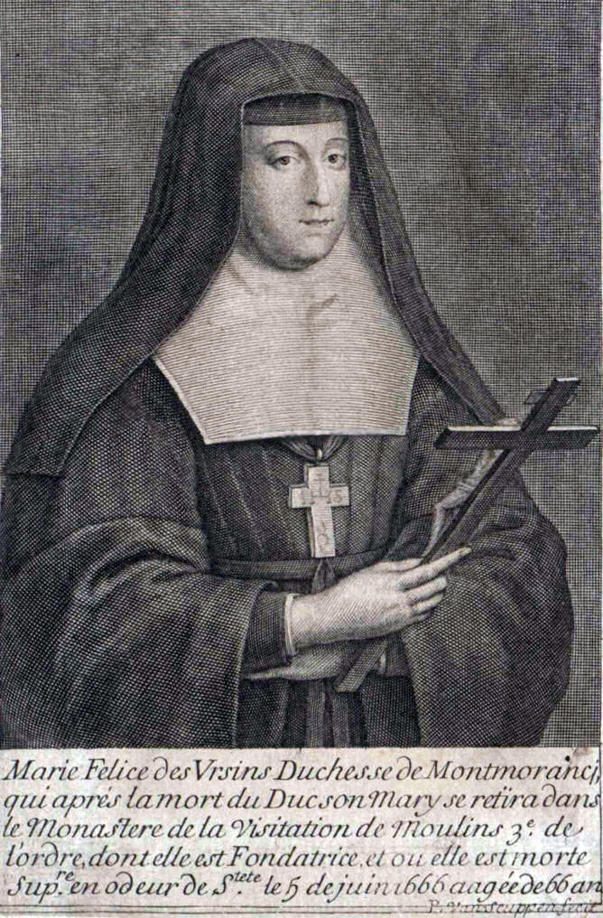 "After the death of the duke, her husband, she retired to the monastery of the Visitation of Moulins, the 3rd of the order; she was itsfoundress and died in the odor of sanctity as its superior, 5 June 1666, age 66."