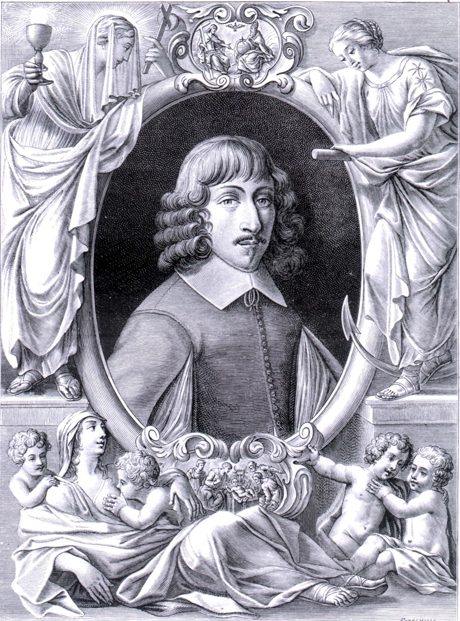 Gaston de Renty, collaborateur de saint Vincent pour l'accueil des nobles lorrains réfugiés ˆ Paris, Membre influent de la Cie du Saint-Sacrement.Les allégories autour du portrait représentent la foi, l'espérance et la charité