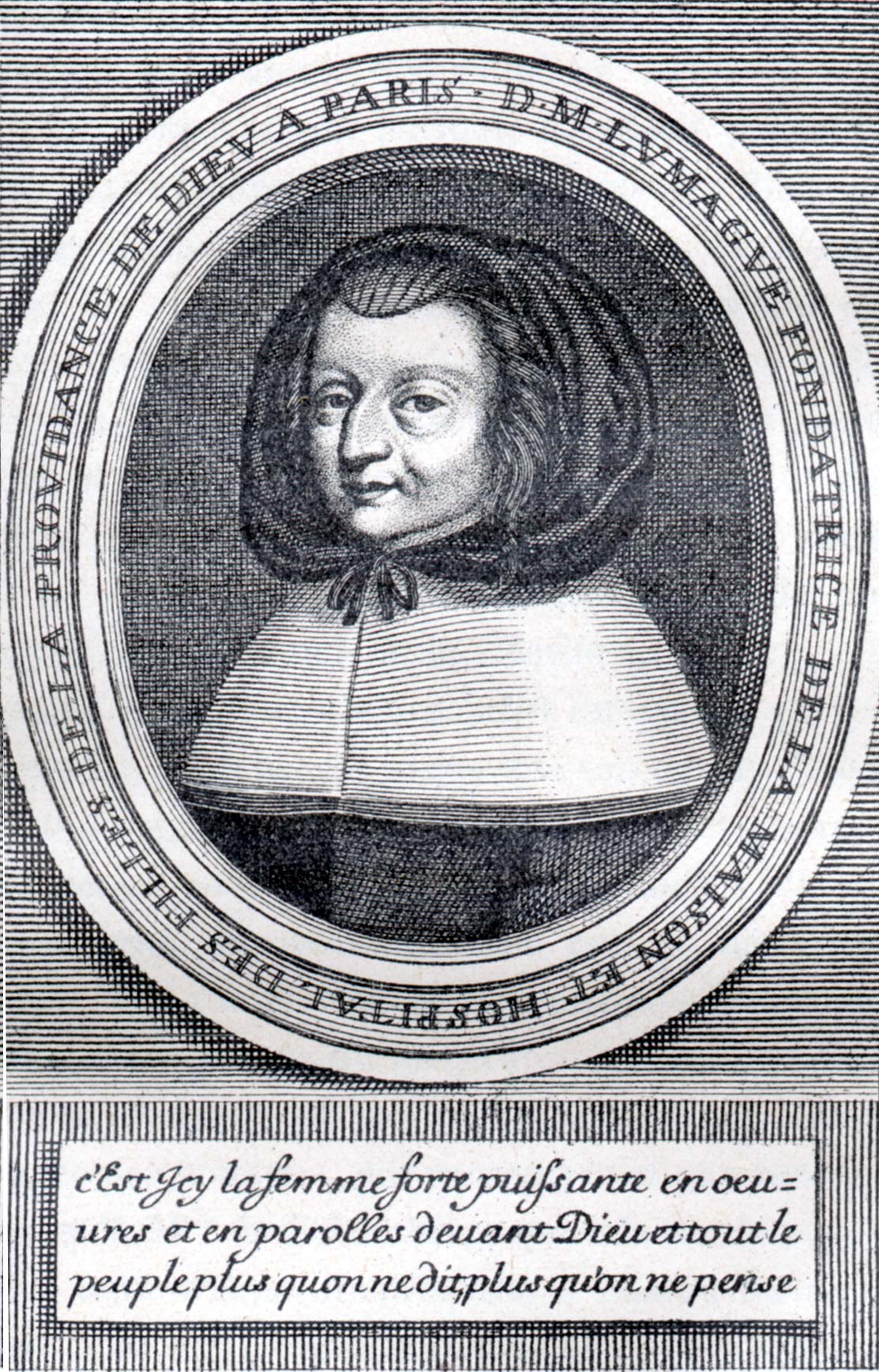 Oval text: Dame M. Lumague, foundress of the house and hospital of the Daughters of the Providence of God.