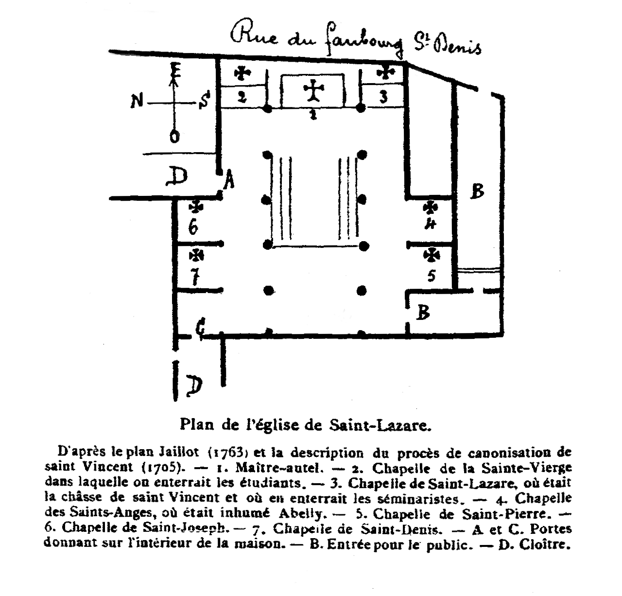 Text: 1. Main altar. 2. – Chapel of the Blessed Virgin ; burial place for students. – 3. Chapel of Saint Lazare, where the reliquary of Saint Vincent was placed ; also, burial place for novices. – 4. Chapel of the Angels, where Abelly was buried. – 5. Chapel of Saint Peter. – 6. Chapel of Saint Denis. – A and C : doors leading into the house. – B. Public entry. – D. Cloister.