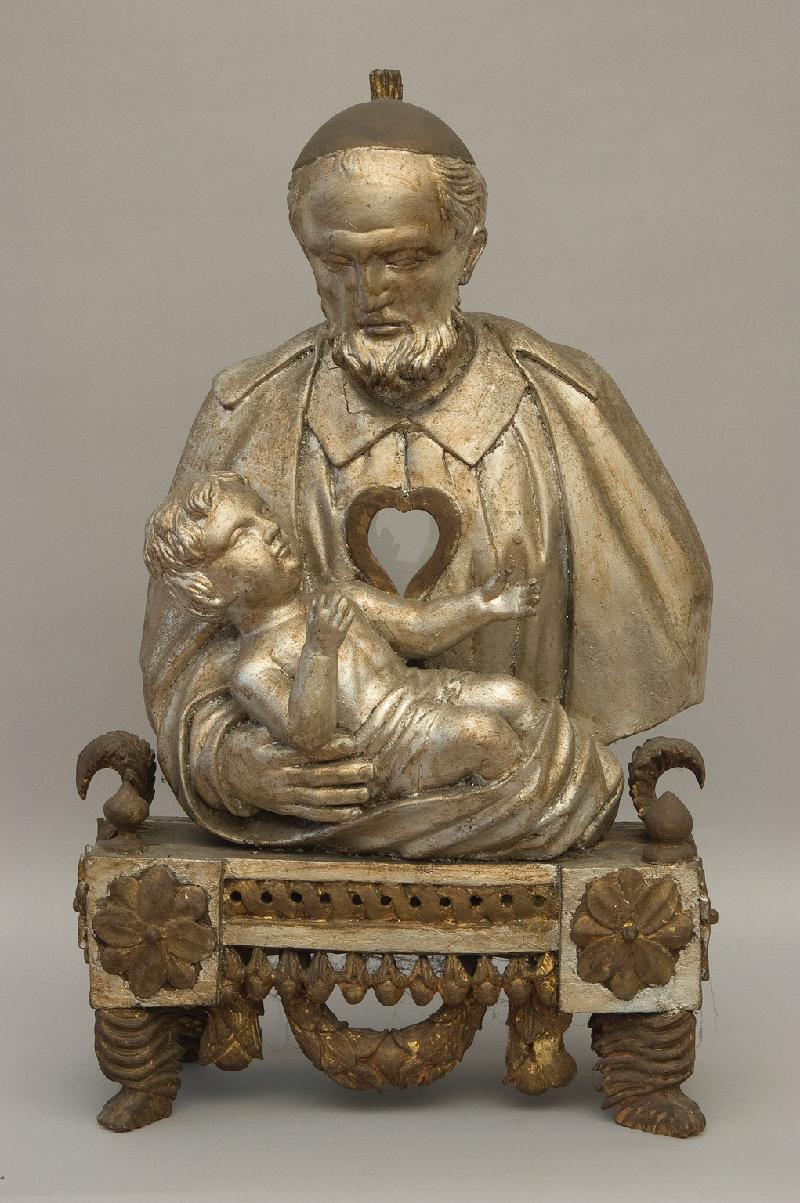SVDP with a child; gilded or silvered wood; relic removed