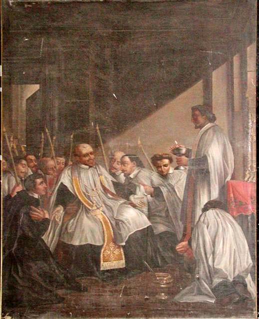 Vincent de Paul, dying, seated with cassock, surplice, stole; about to receive Holy Communion (Viaticum); original from Vincentian school, Montdidier; moved to church, Folleville. 19th century copy
