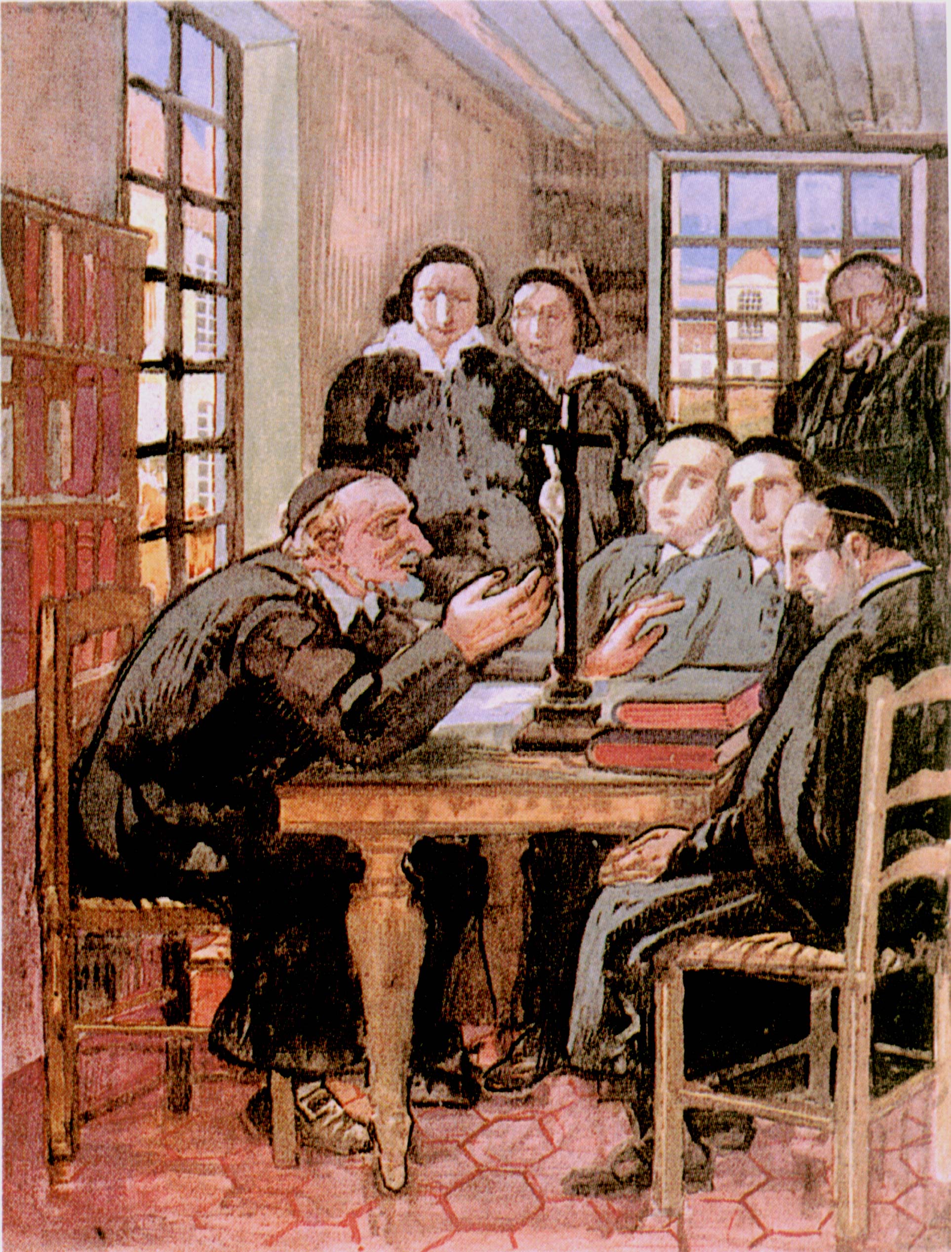 Painting (?), Vincent de Paul, seated, cassock, skullcap, at table, teaching his priests; work of Maurice Denis; in Goyau, Histoire de la Nation Française. Histoire religieuse; location of original unknown