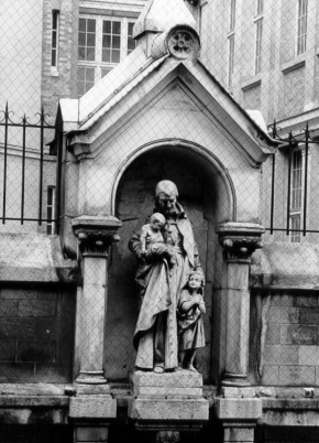 BW photo, Vincent de Paul, standing, cassock, mantle, with two children, shown in a niche, before a building, probably a school, maybe France; location of original unknown