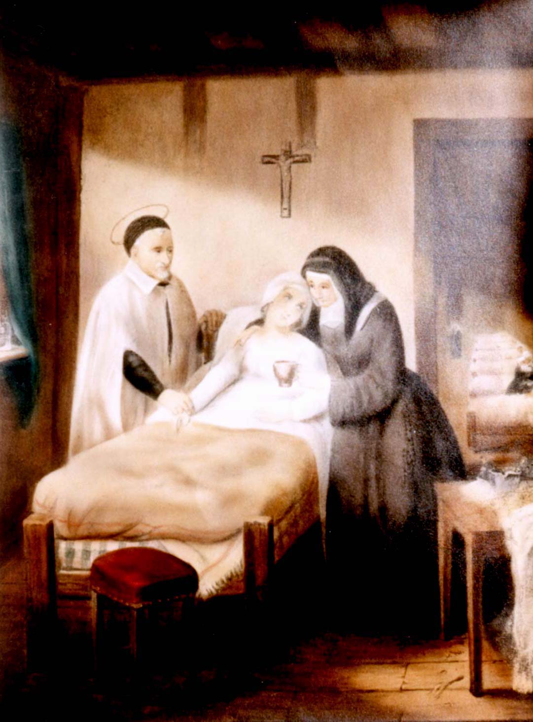 Vincent de Paul and Louise de Marillac at deathbed of Marguerite Naseau