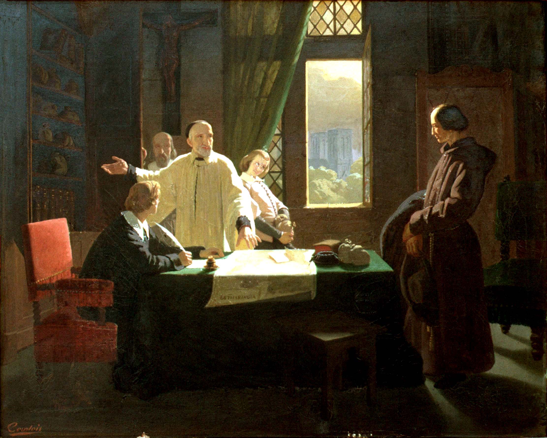 Oil on canvas (?), Vincent de Paul, standing at table, cassock, surplice, skullcap, sending Bro. Mathieu Regnard on mission to devastated provinces; location of original unknown