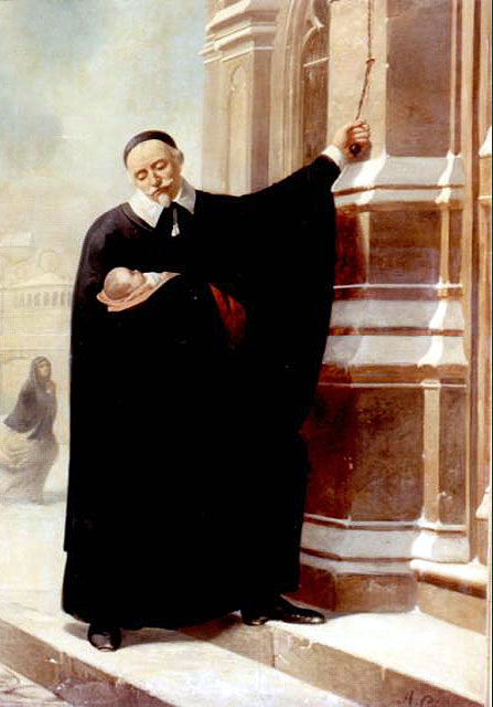 Oil on canvas; Vincent de Paul, standing, cassock, cape, skullcap; holding infant in red blanket, pulling bell rope at church; mother behind; snow scene; original in cathedral of Dax, artist: Alfred André Géniole