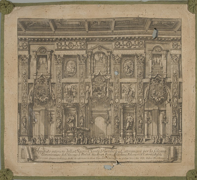 Text: Interior decoration of the Sacrosanct Lateran Basilica for the solemn canonization of St. Vincent de Paul, John Francis Regis, Giuliana Falconieri, Catherine Fieschi