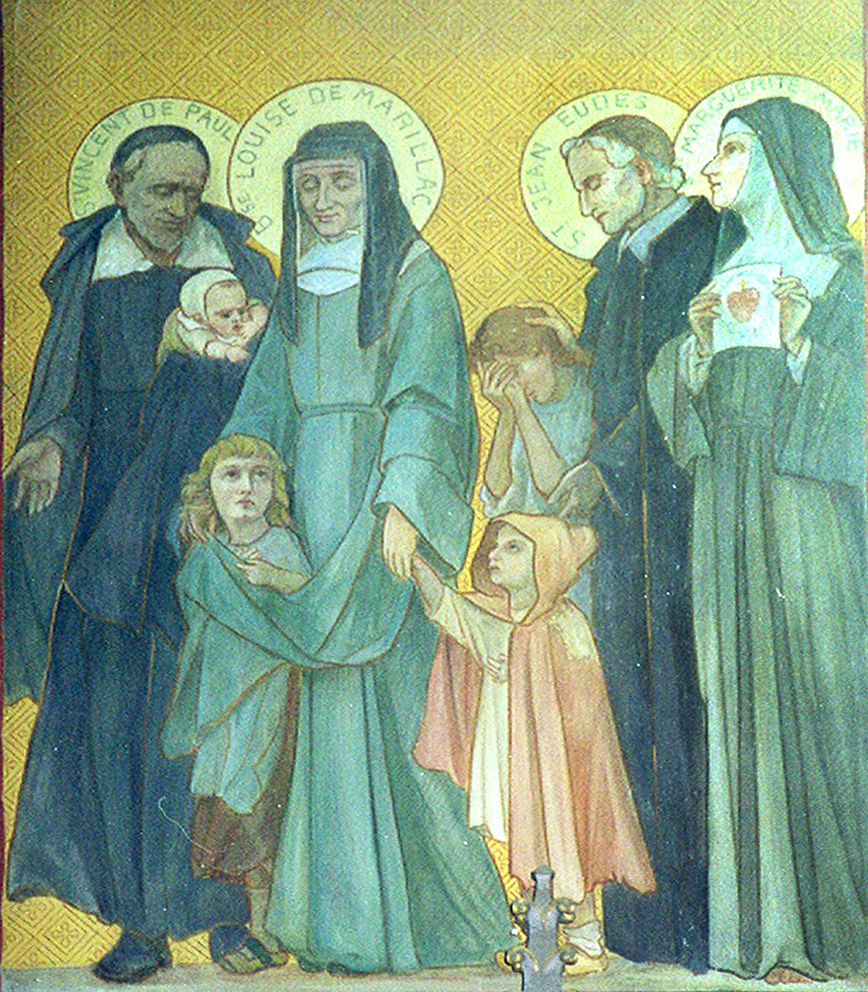 Vincent de Paul, Louise de Marillac, John Eudes, Margaret Mary, with poor children; Original in St. Therese church, Angers