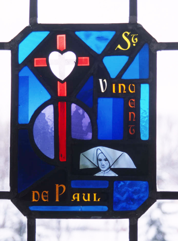 SVdP window, with emblem of Daughters of Charity, face of Catherine Labouré