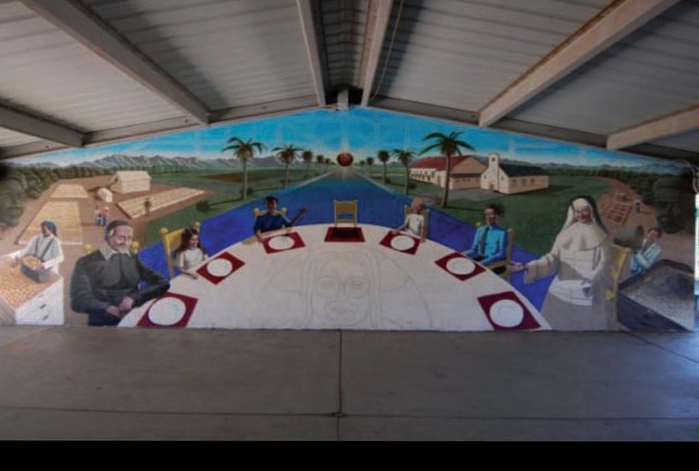 Students, Sister, SVdP, Cesar Chavez at left, orkers in the fields, parish church and school
