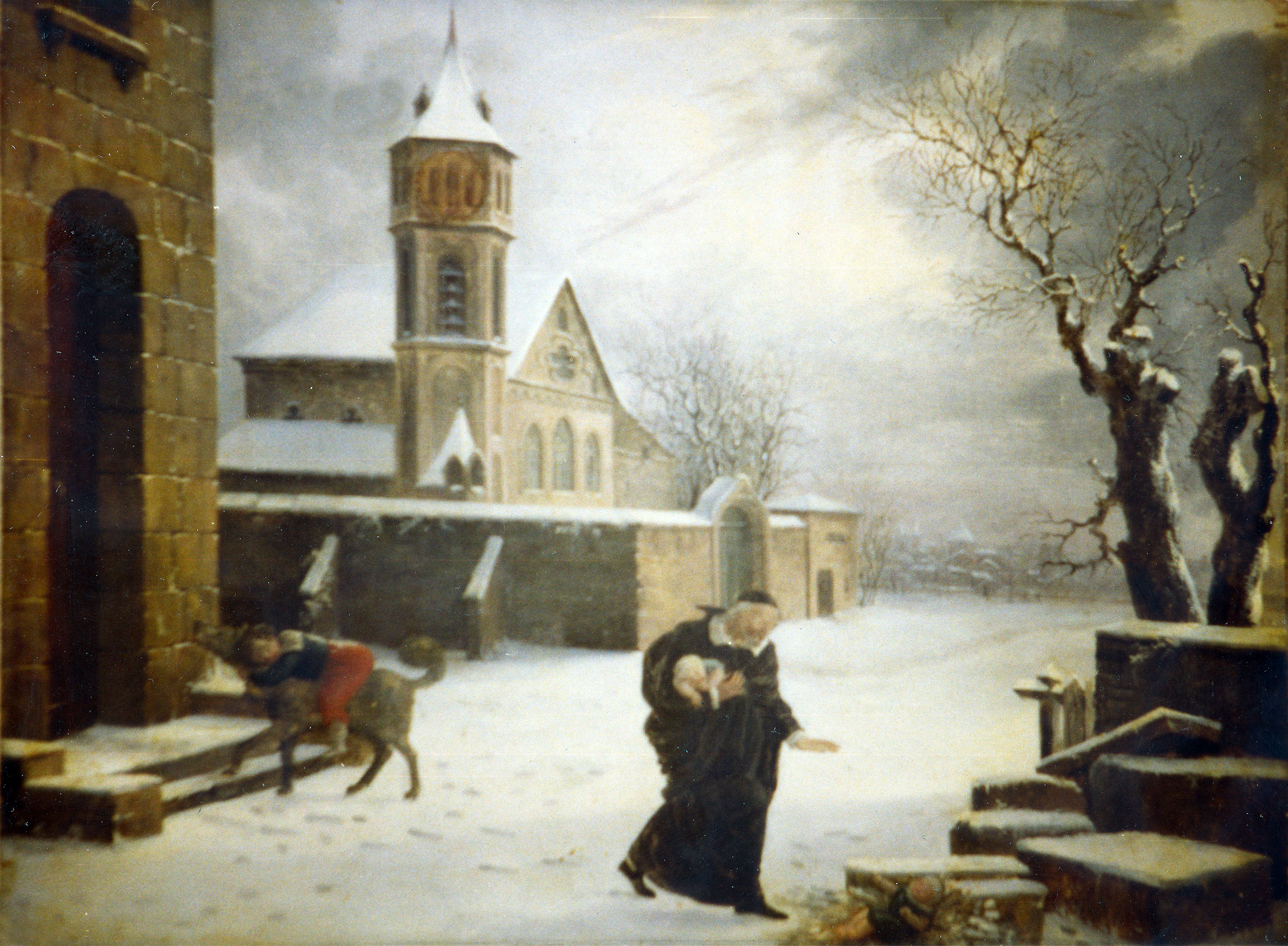 Vincent de Paul, standing, cassock, mantle, skullcap; holding child, finding another on the groud; another on back of a dog (?), exterior snow scene; photo in Gunth collection, Paris; location of original unknown