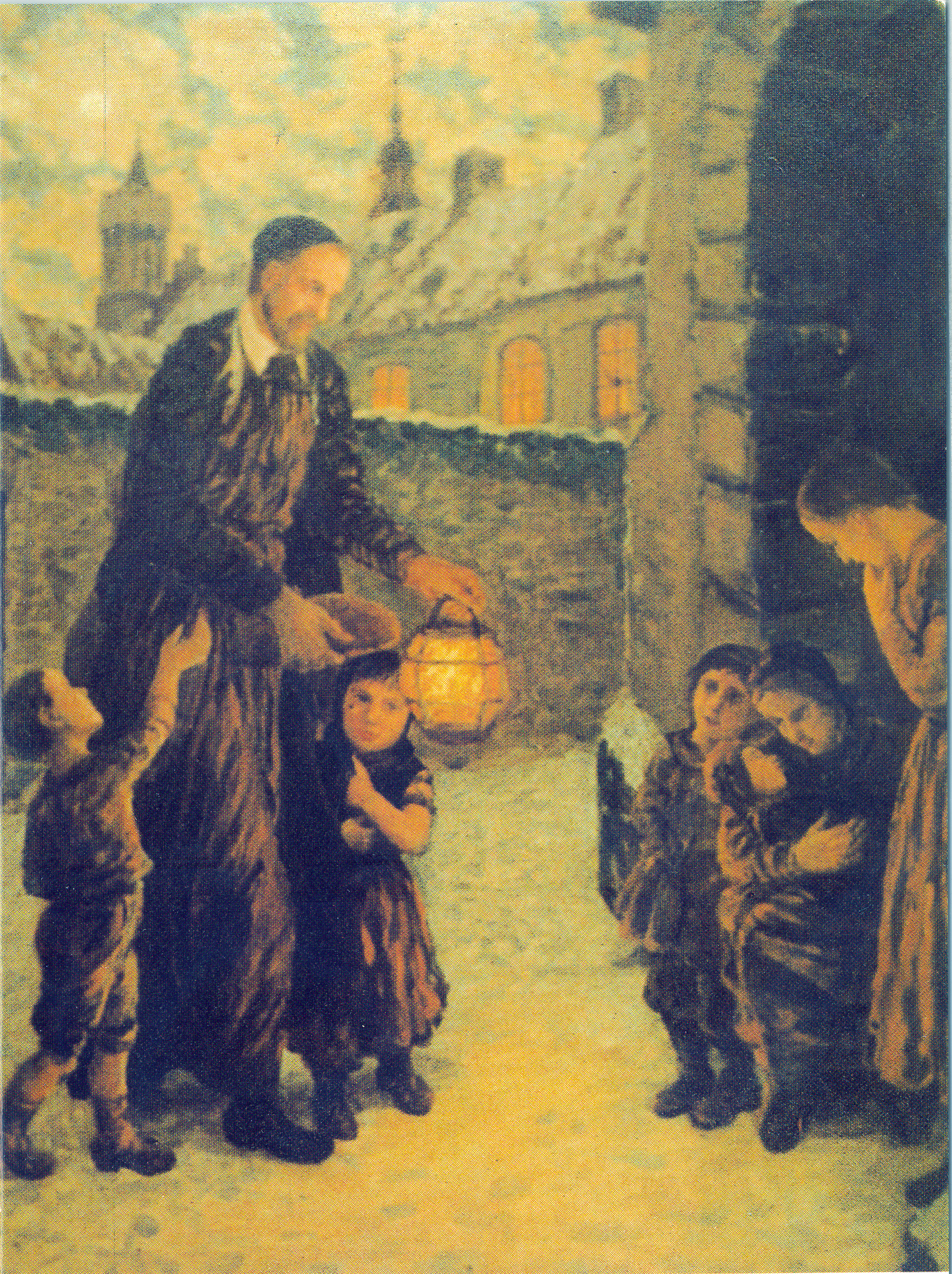 Vincent de Paul, standing, cassock, skullcap; holding lantern, loaf of bread; figures huddled against the snow; location of original unknown; photo in Gunth collection, Paris