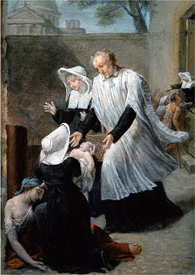 Oil, Vincent de Paul, standing, cassock, surplice; with foundlings, Daughters of Charity and poor women; artist Antoine Jean Joseph Ansiaux; alternate version of Nantes canvas