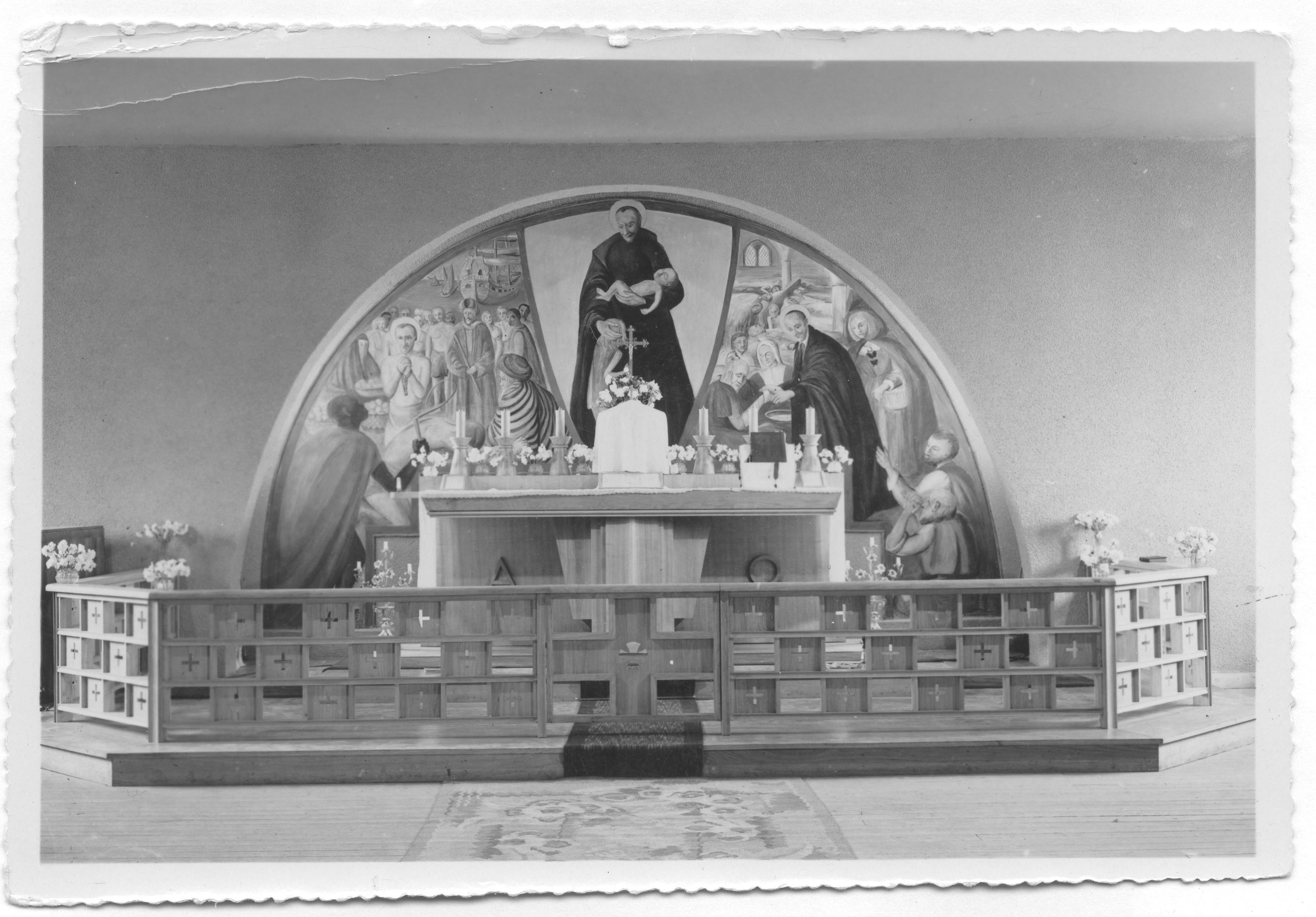 Three panels depicting Vincent de Paul as captive on galley, with children, in a hospital with Daughter of Charity and Lady of Charity.