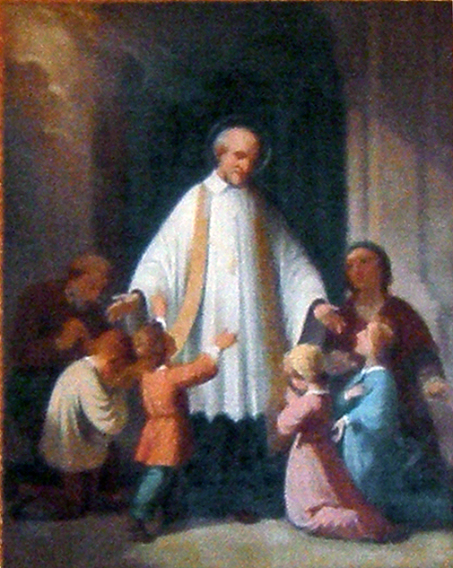 Vincent de Paul, standing, cassock, surplice, gold stole; photograph of a photograph; Courtesy of Archives of Daughters of Charity, Paris