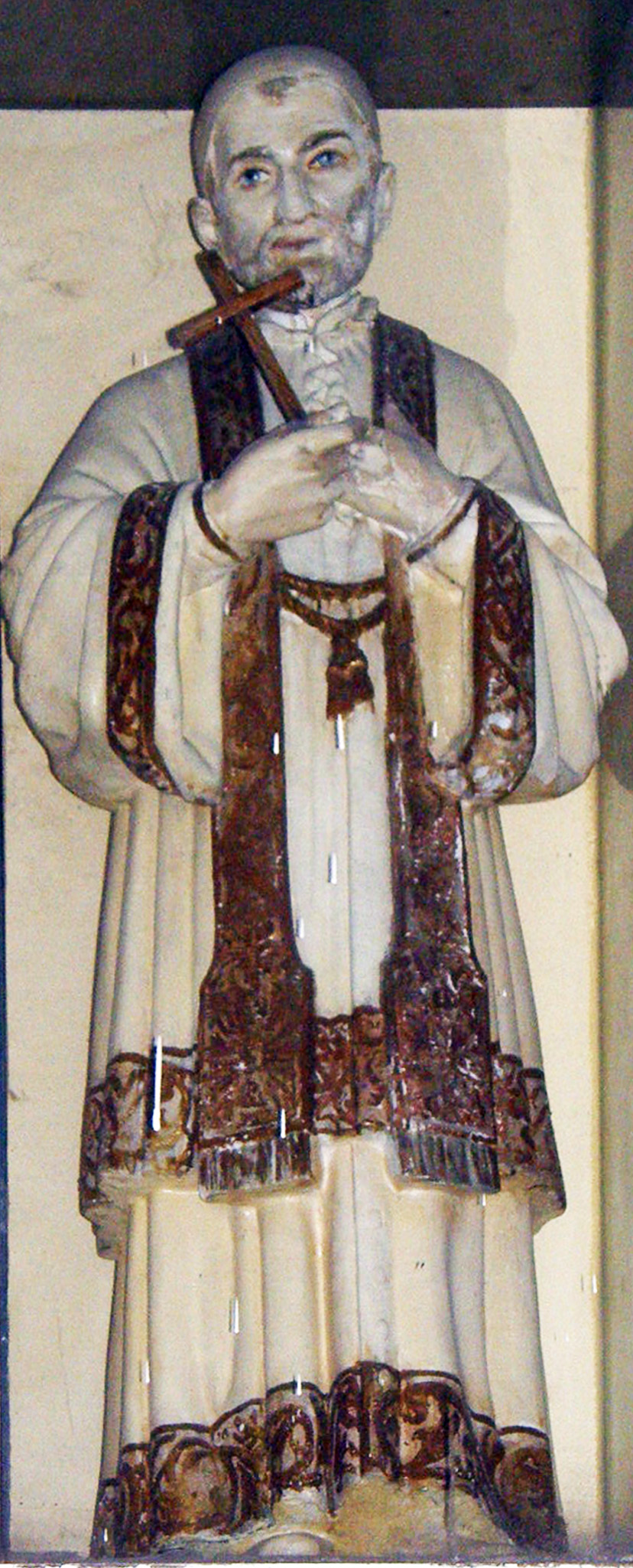Painted stone statue; Vincent de Paul, standing, cassock, surplice, stole, in white; holding cross; original in Vincentian parish, Lima