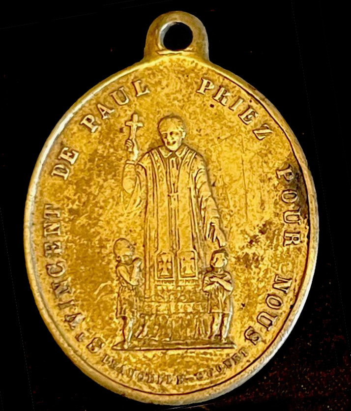 Text: SVdP, Pray for Us; VdP with crucifix, children