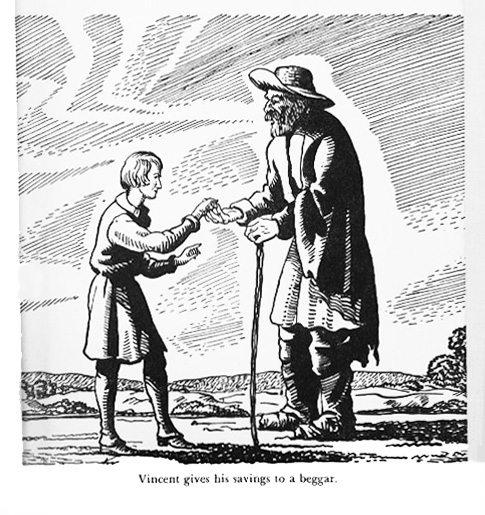 Vincent as a boy gives his savings to a beggar