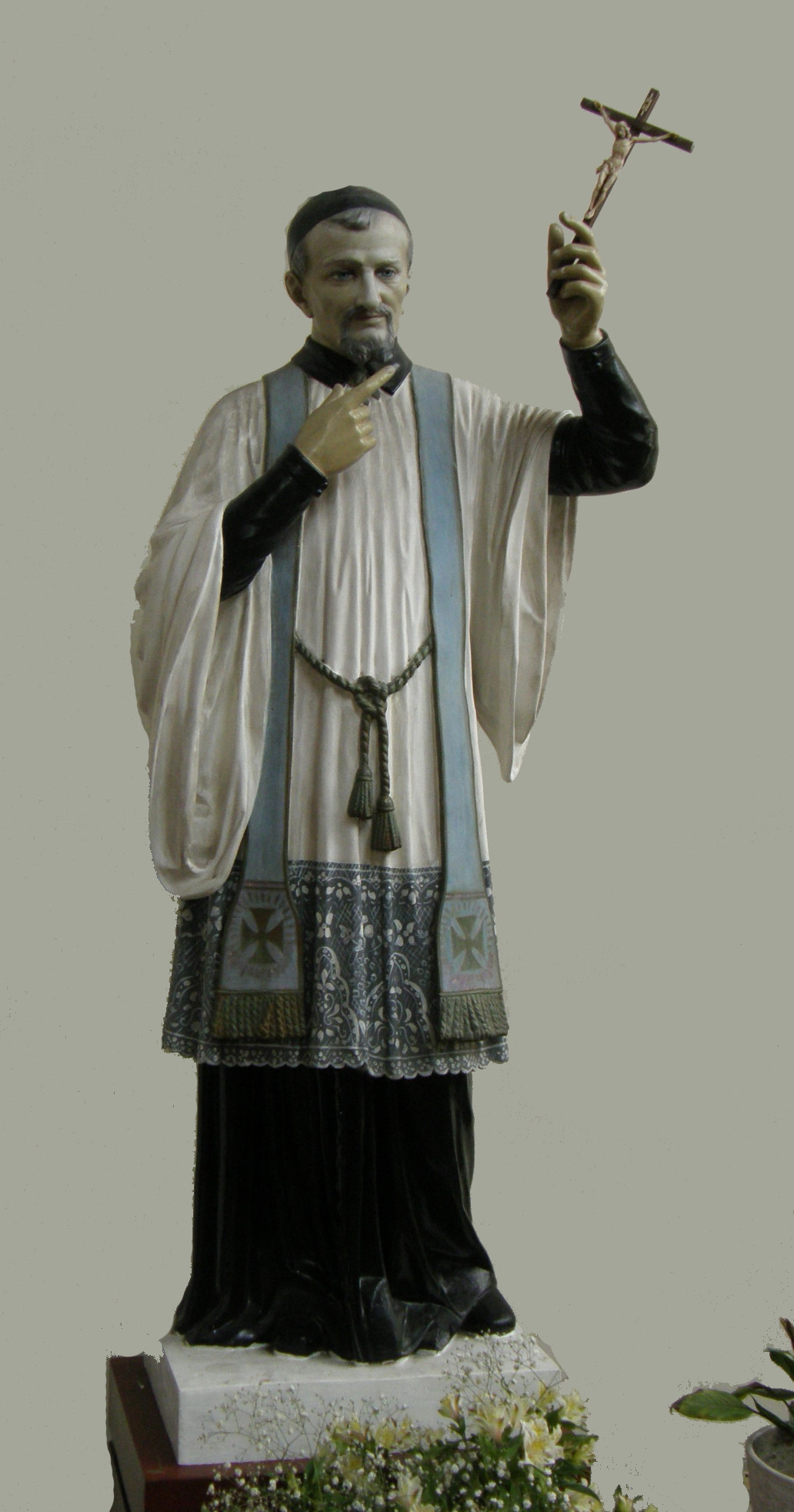 Plaster statue; Vincent de Paul, standing, cassock, surplice, blue stole, skullcap, holding crucifix; original in Vincentian novitiate, Lima