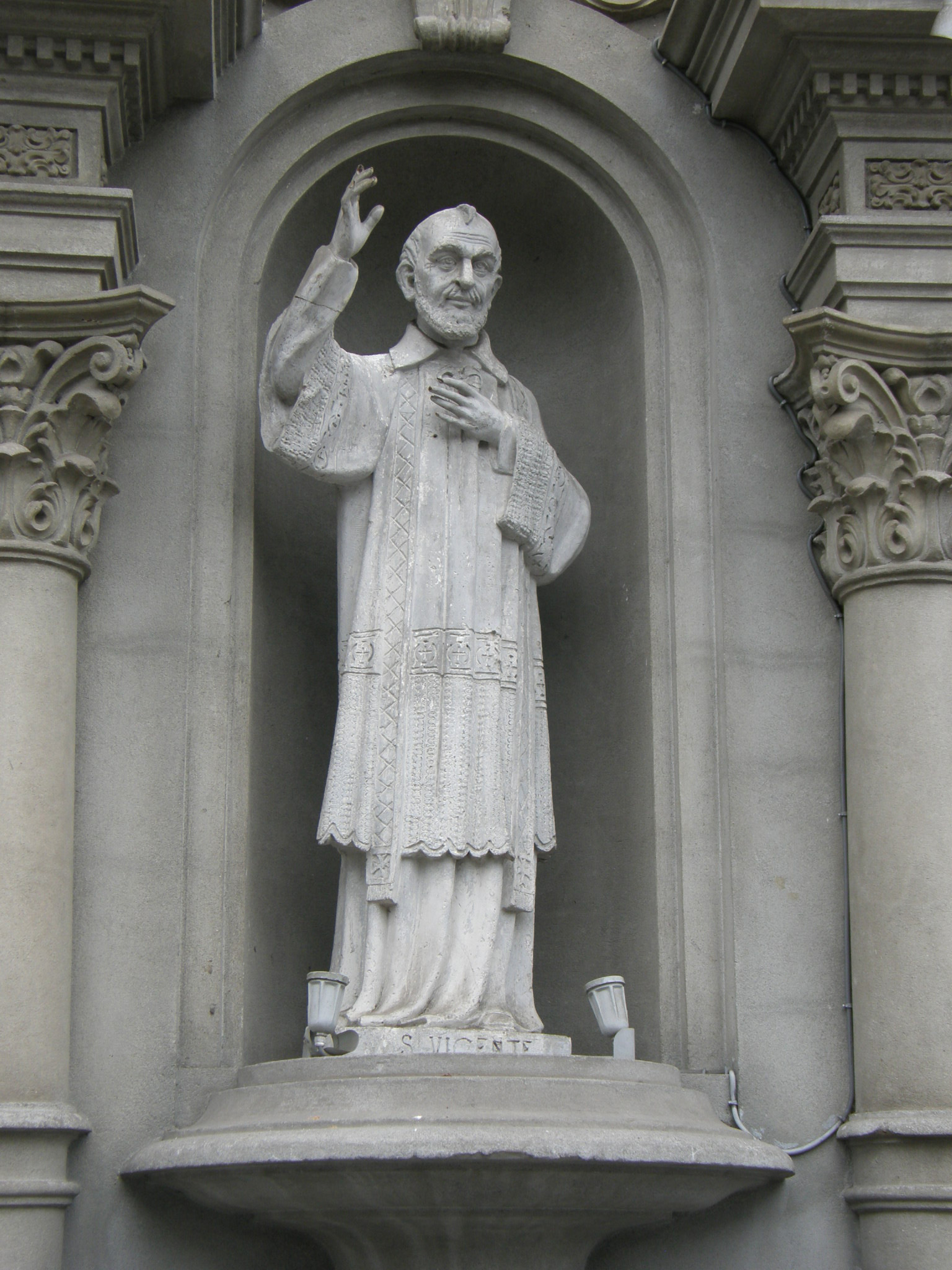 Carved stone statue, Vincent de Paul, standing, cassock, surplice, stole; perhaps missing crucifix in right hand; facade of Vincentian church, Miraflores, Lima