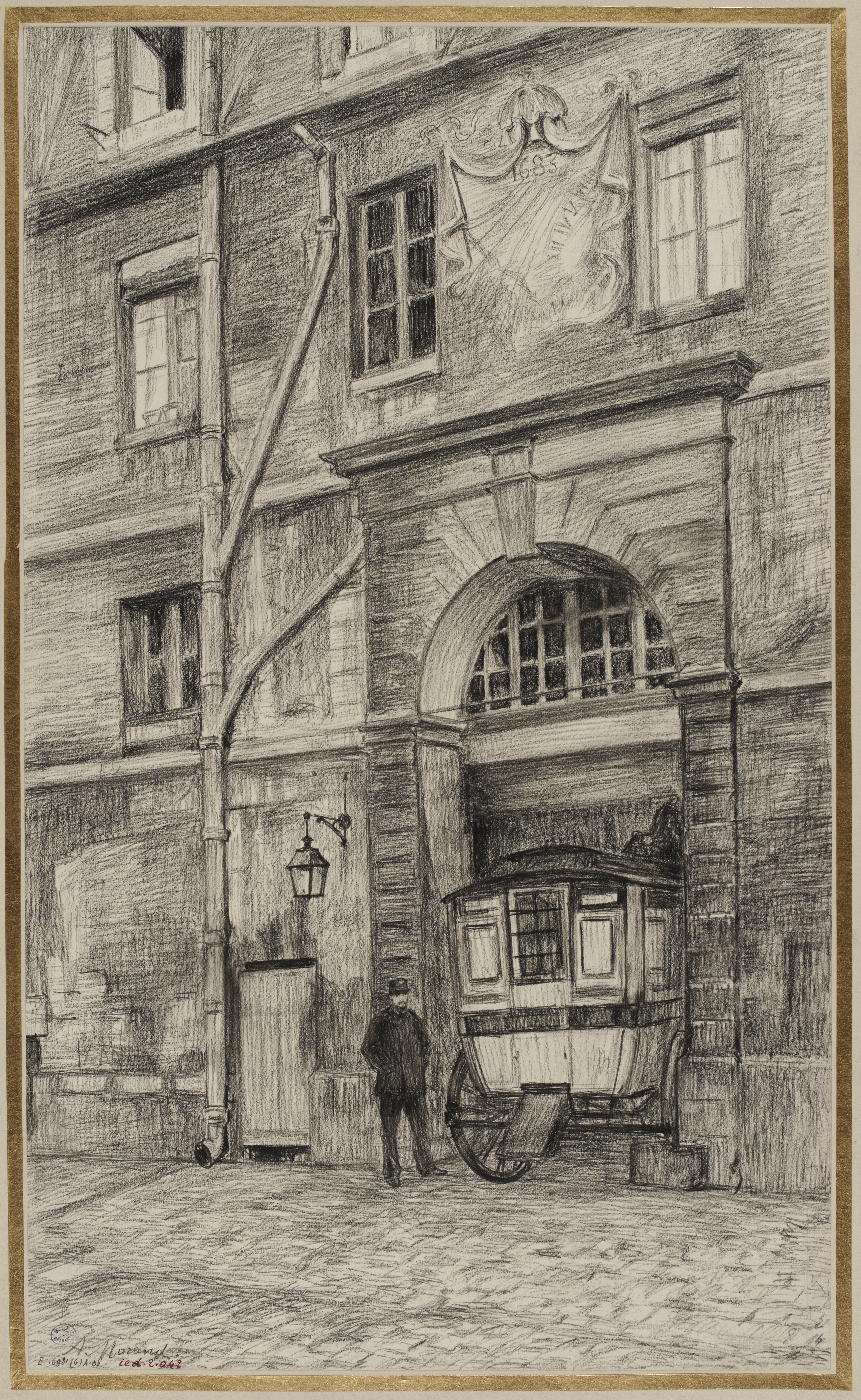 Cart to carry prisoners, at main entry; sundial above