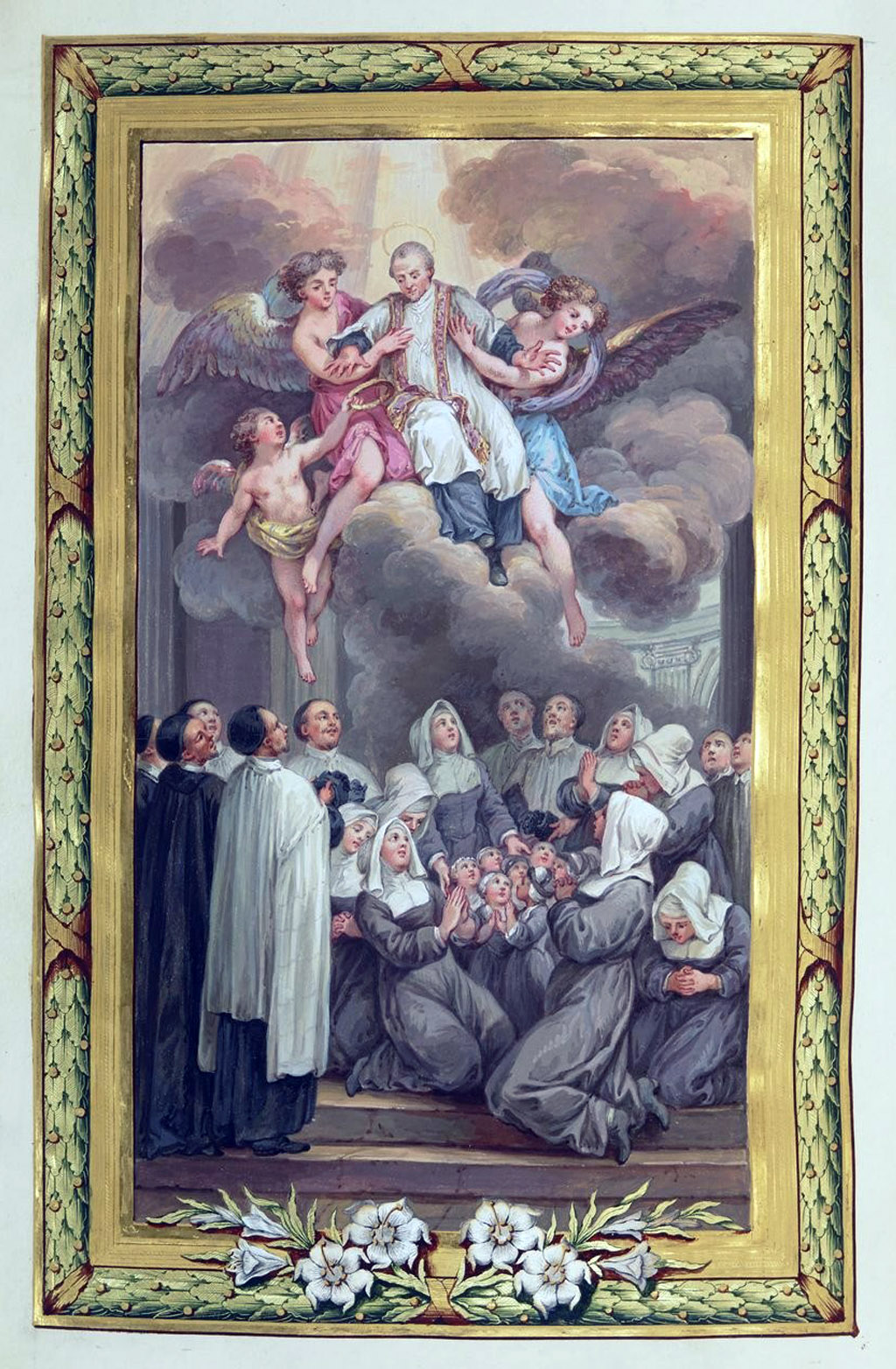 Hand-painted illustration, book of epistles and Gospels, Vincent taken to Heaven, with Missions and Daughters of Charity (in grey habit)Internet image