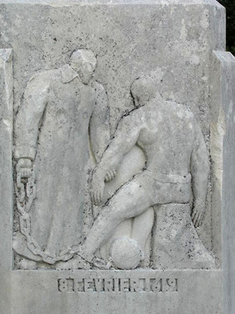Granite frieze; Vincent de Paul holding chains of galley prisoner; hospice of Lanot, Dax