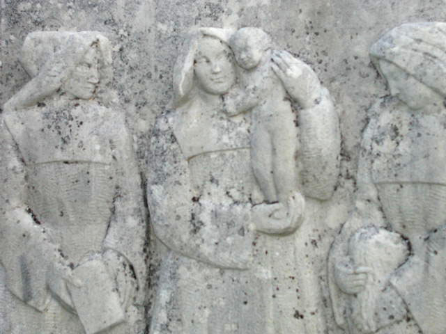 Granite, frieze; Daughters of Charity with children; original at hospice of Lanot, Dax