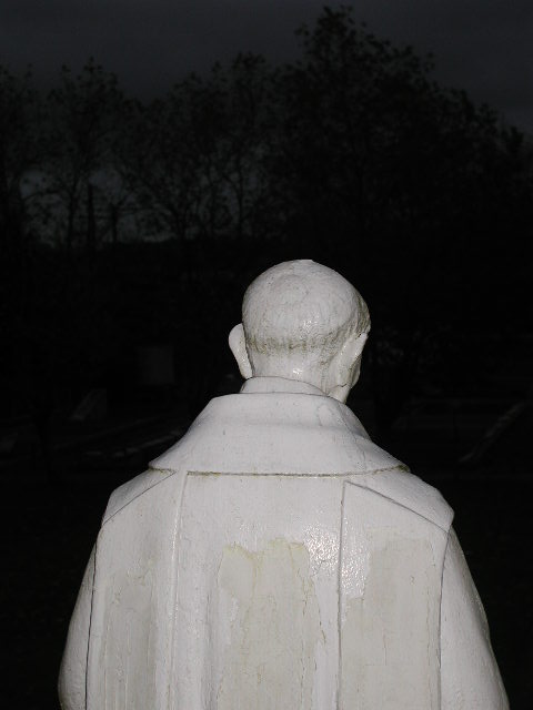Metal, painted; Vincent de Paul from behind, standing, cassock, mantle, showing clerical tonsure; original at Notre Dame du Pouy, Dax