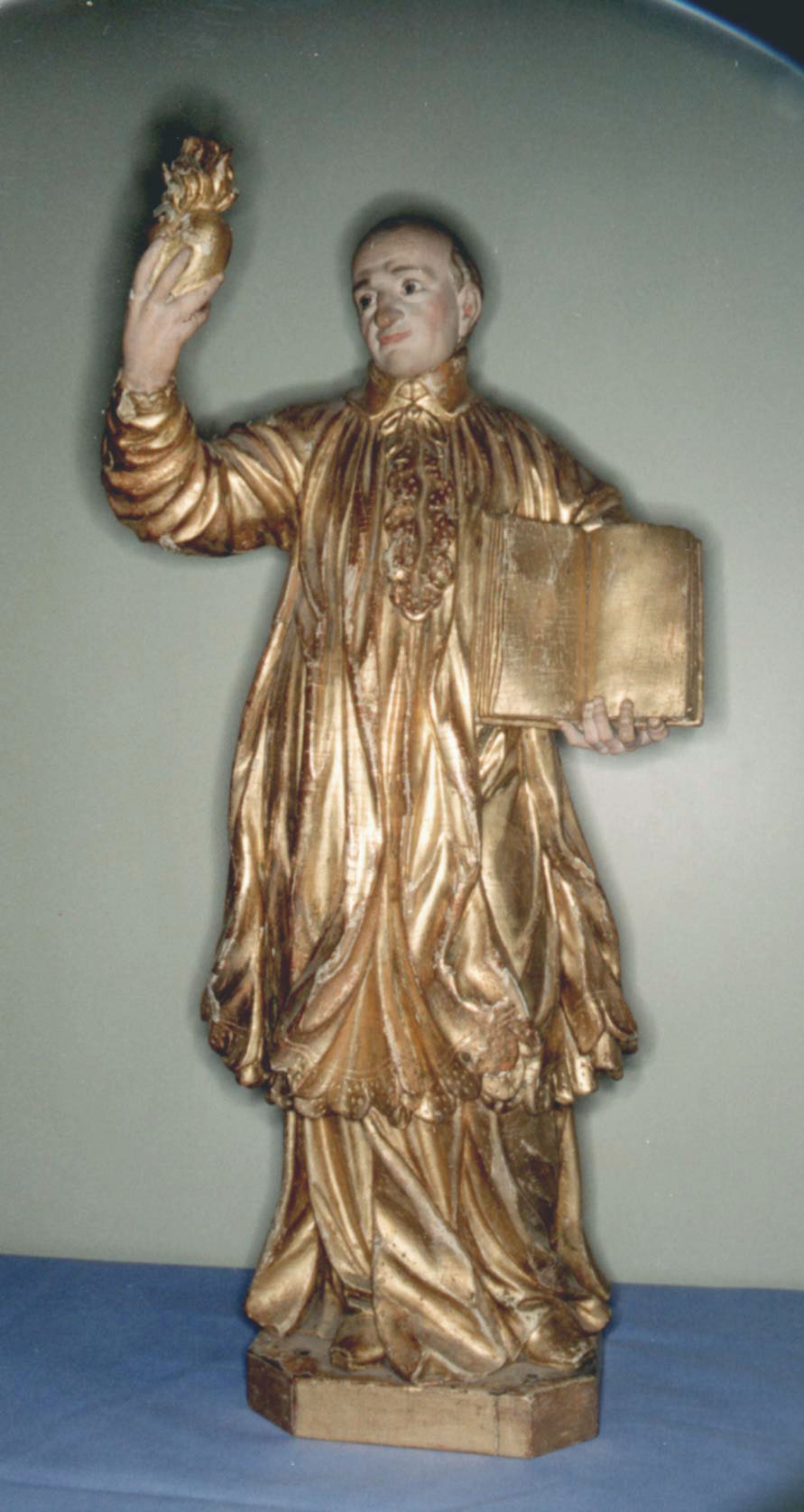Gilded and painted statue; Vincent de Paul, dark hair, cassock, surplice, holding heart of charity, open book; possibly the earliest known statue (1730) of Vincent de Paul; original in chapel of hospital, Chaumont