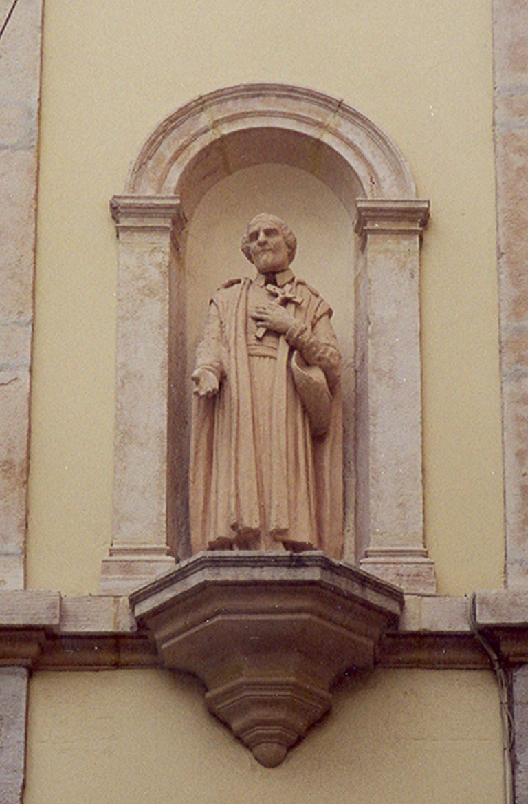 Stone statue, Vincent de Paul standing in niche, cassock, cincture, mantle, holding crucifix to his chest; original at Daughters of Charity house, rue du Doyenné
