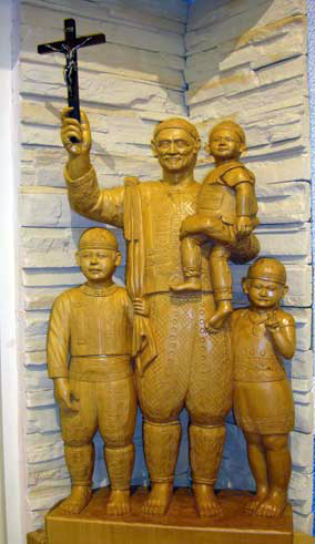 Carved wood, Vincent de Paul standing, in native dress, with three children; holding crucifix;