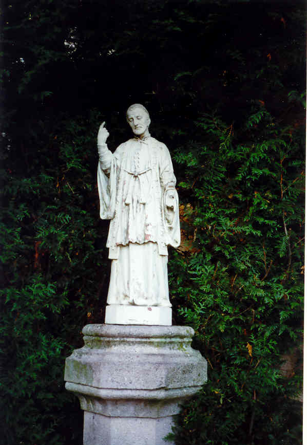 Stone statue, Vincent de Paul, standing, cassock, surplice, stole, arm raised, probably originally with crucifix; original in Valfleury