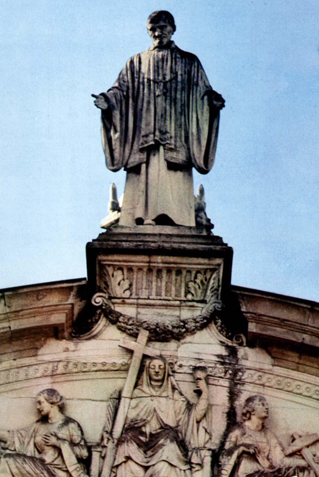 Stone; Vincen de Paul, standing, cassock, surplice, stole, skullcap, arms extended in gesture of welcome (?), original at chapel of Berceau de St Vincent de Paul, copy of others in Paris