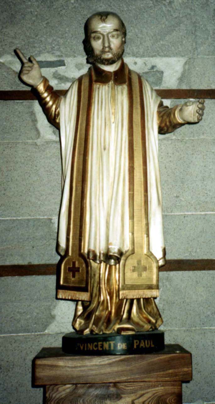 Painted and gilded wood; Vincent de Paul, standing, cassock, surplice, stole, diocesan black rabat at the neck, crucifix missing from left hand, gesture of preaching; original formally in St. Flour (current location unknown); another, church in Murat