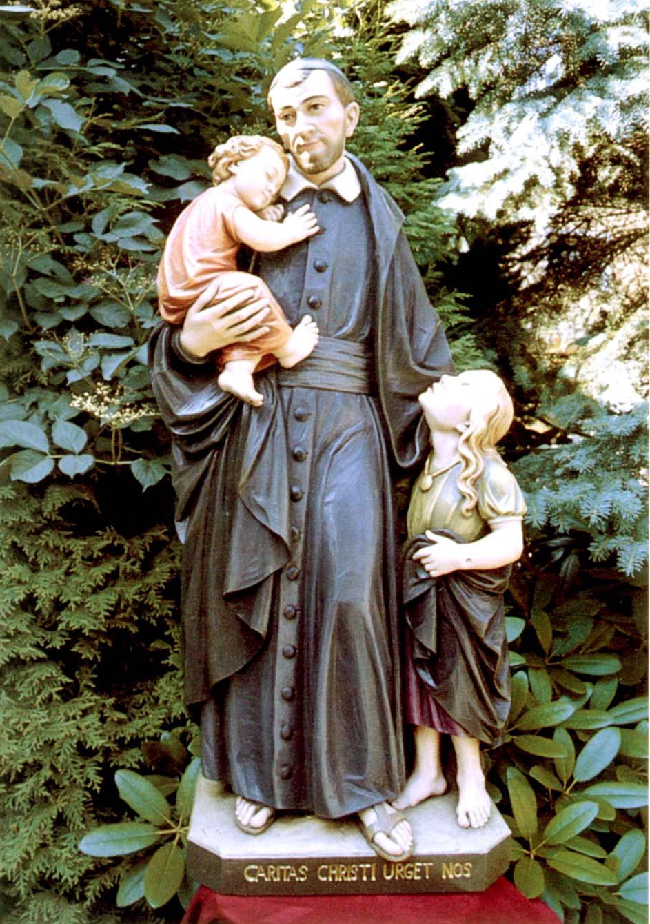 Painted statue, young Vincent de Paul, sandy hair, standing, cassock, cincture, cape, skullcap, sandals, with two children; Latin motto of Daughters of Charity below: The charity of Christ impels us; original in St. Ulrich