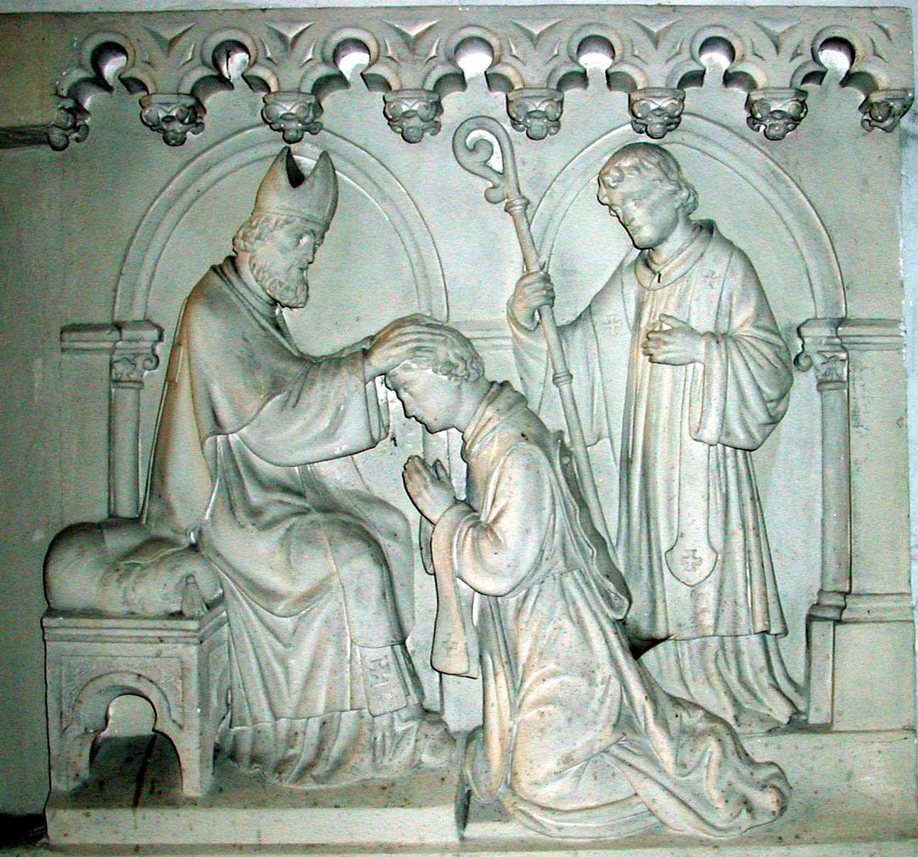 Frieze on altarpiece; Vincent de Paul ordained by bishop to priesthood, assistant priest with crozier; original in parish church, Chateau l'Eveque