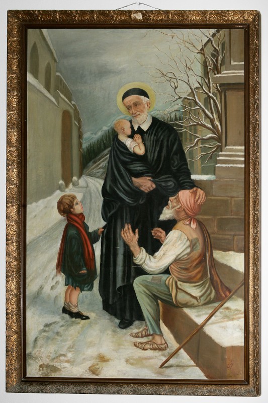 VdP, with poor child and handicapped man; location not given