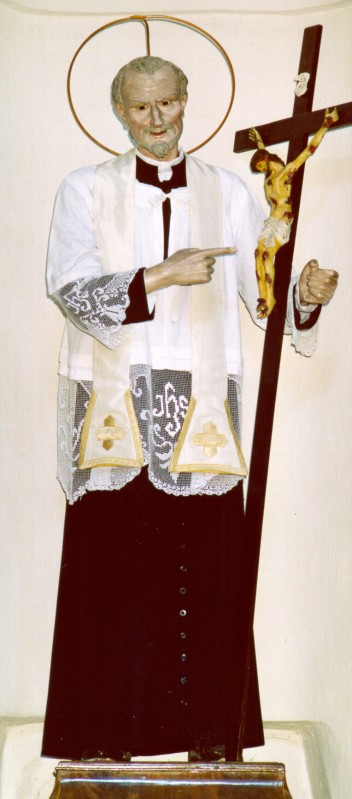 Clothed statue; large crucifix; metal halo; white stole
