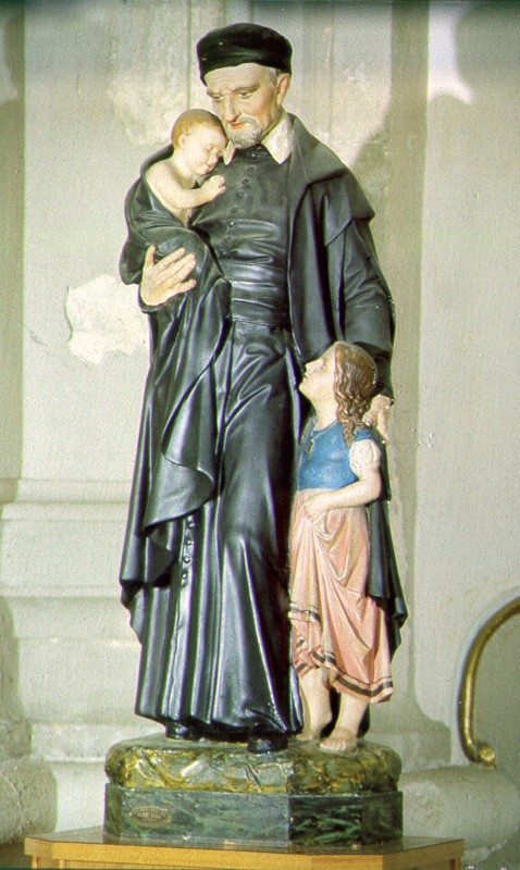 VdP wearing large soft cap; girl with Miraculous Medal; location not given