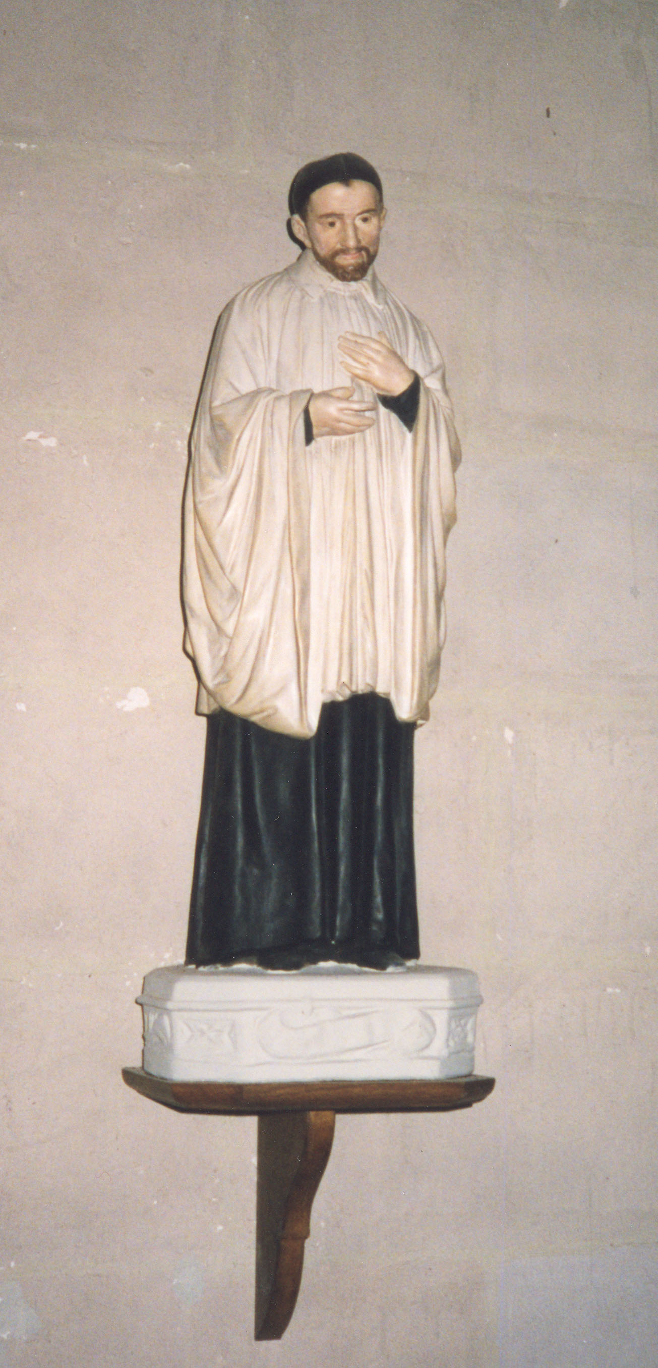 Painted statue; Vincent de Paul, standing, cassock, surplice, skullcap; probably held a crucifix, now missing; original in parish church, Amou